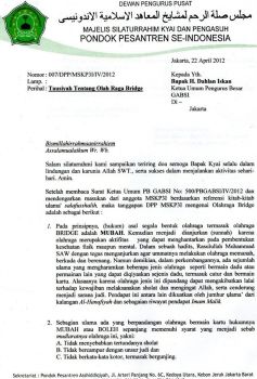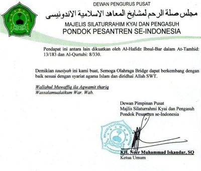 Terakhir ada fatwa dari Majelis Silaturahmi Kyai dan Pengasuh Pondok Pesantren se Indonesia yang memberikan Tausyiah tentang olahraga bridge seperti terlampir.
