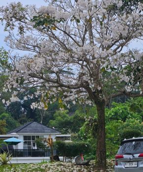 Seakan menyambut kemenangan Mas Lutfi, ada 5 pohon pelindung di pintu masuk kluster deRoyale langsung berbunga. Yang menarik bunganya banyak sekali berwarna putih. Sampai berserakan di bawah. Saya kira bunga sakura, ternyata bukan.