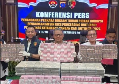 Satumejanews.id. BALIKPAPAN – Kasus dugaan tindak pidana korupsi pengadaan mesin penggilingan gabah alias Rice Processing Unit (RPU) senilai Rp 24,9 milyar tahun anggaran 2024 di Dinas Ketahanan Pangan Kutai Timur (Kutim) memasuki babak baru. Tim penyidik Reserse Kriminal Khusus Kepolisian Daerah Kalimantan Timur (Ditreskrimsus Polda Kaltim), menetapkan tiga tersangka dan menyita uang Rp 7 milyar.