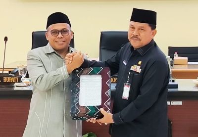 Wabup Gusti Rosyadi kemudian menyerahkan secara simbolis Rancangan tersebut kepada Ketua DPRD Pahrijani di hadapan sidang para anggota dewan dan tamu undangan.
