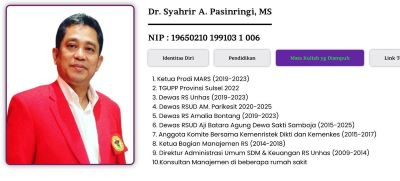 Dr Syahrir sendiri kabarnya belum berstatus guru besar. Tapi karena senior jadi dipanggil “profesor.”  Dia pernah menjabat ketua Prodi MARS Unhas, Dewas RS Unhas (2019-2023), Dewas RSUD AM Parikesit Tenggarong (2020-2025), Dewas RS Amalia Bontang (2019-2023), Dewas RSUD Aji Batara Agung Dewa Sakti Samboja (2015-2025), anggota Komite Bersama Kemenristek Dikti dan Kemenkes, Ketua Bagian Manajemen RS serta konsultan manajemen di beberapa rumah sakit.