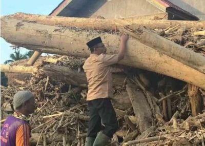 Kayu besar yang terbawa di banjir bandang Sumatra.(Ant)